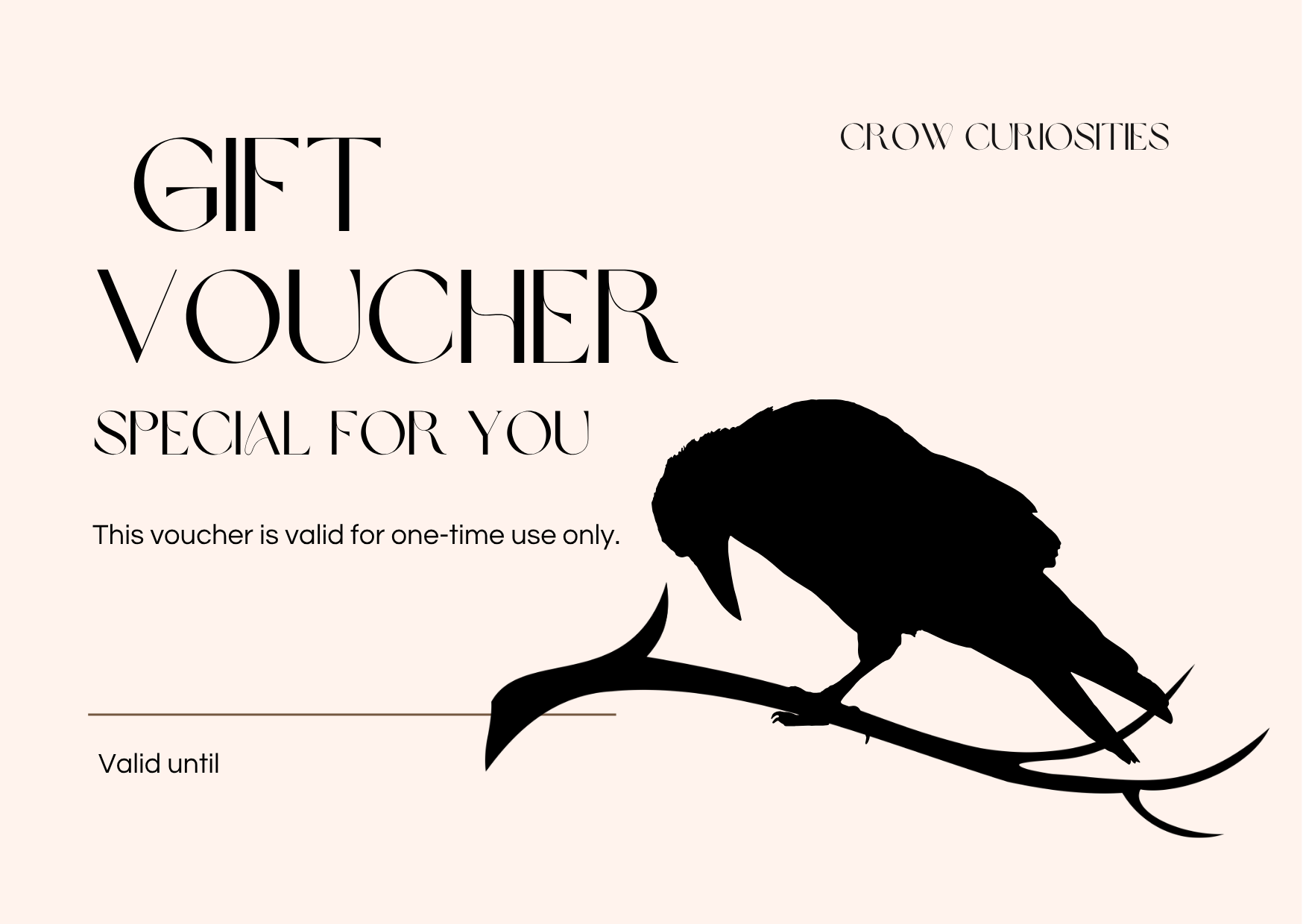 Our Crow Curiosities Gift Card is purchased online through our Shopify store and can be redeemed in person at our Stirling shop. Perfect for anyone who adores crystals, witchcraft supplies, enchanted teas, and mystical curiosities.